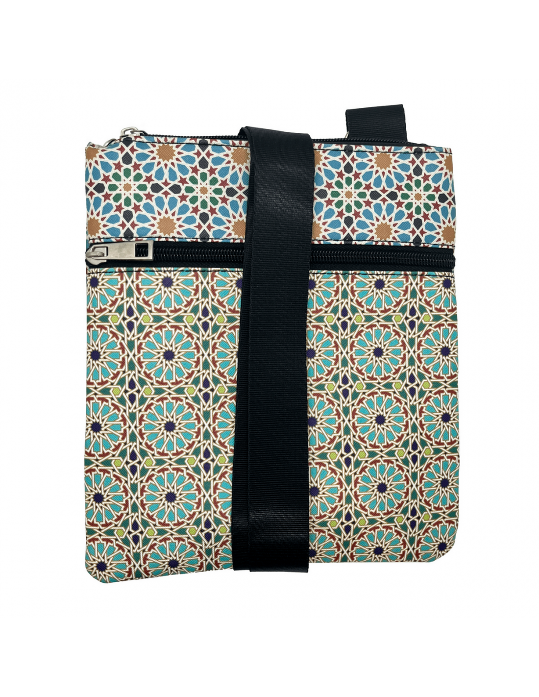 Bandolera polipiel con dos bolsillos de cremallera. Con ilustraciones propias de los mosaicos, azulejos y yeserías de la Alhambra de Granada
