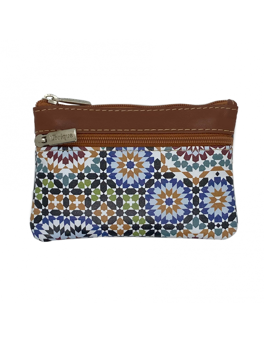 Monedero plano de piel con bolsillo delantero y cremallera, en tonos marrones y azul, inspirado en los mosaicos de La Alhambra, colección Alhambra