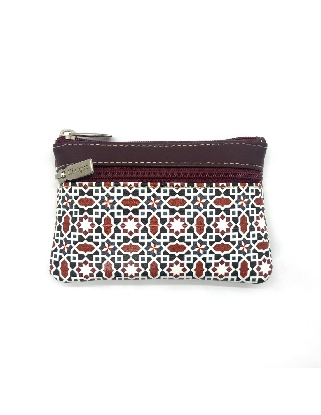Monedero plano de piel en tonos rojos con bolsillo delantero y cremallera, inspirado en los mosaicos de la Alhambra, colección Granada