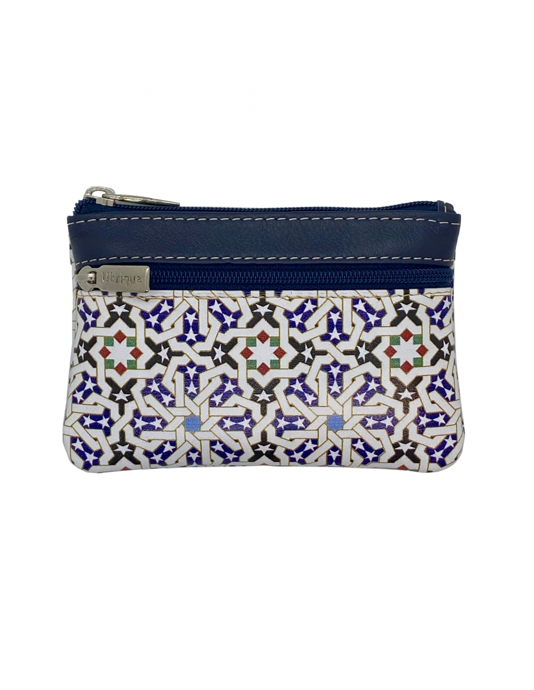 Monedero plano de piel con bolsillo delantero y cremallera, en tonos azules y marrones, inspirado en los mosaicos de La Alhambra, colección Alhambra.