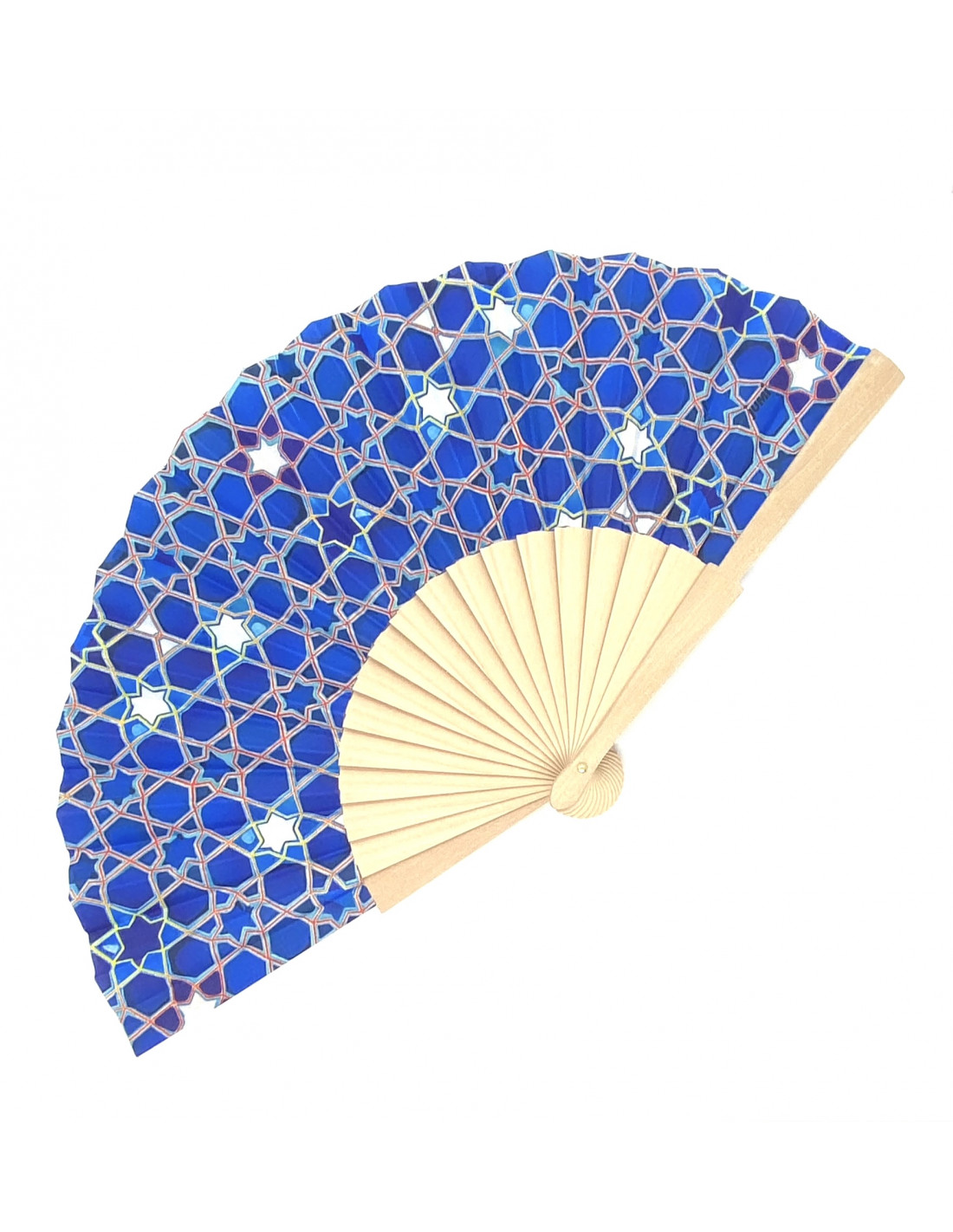 Abanico hecho a mano en algodón de primera y varillas de madera natural de gran calidad. Su diseño exclusivo está inspirado en los mosaicos, lacerías y azulejos que podemos encontrar en La Alhambra (Granada)