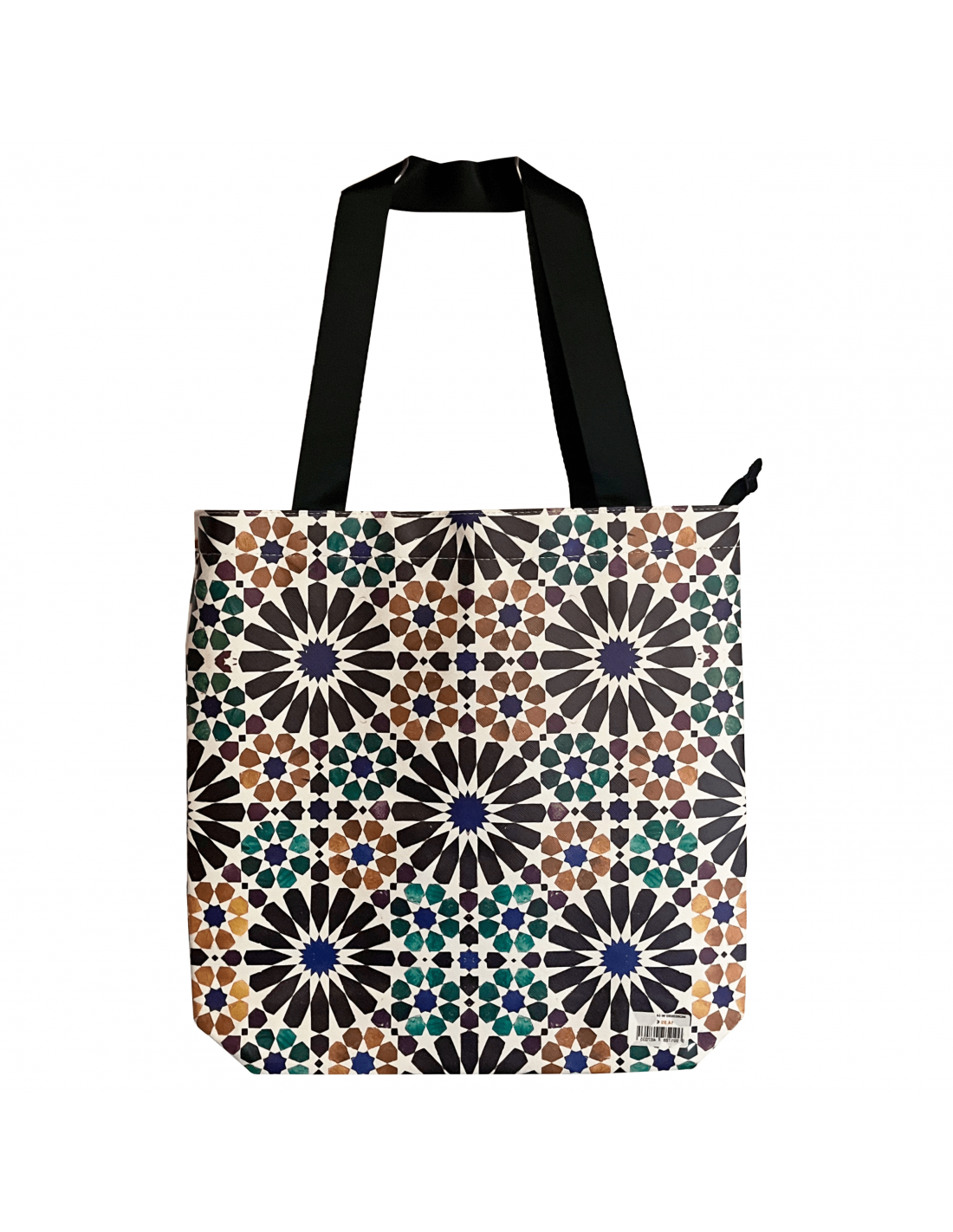 Bolso polipiel mosaicos con cremallera. Con ilustraciones propias de los mosaicos, azulejos y yeserías de la Alhambra de Granada. Correa marrón ajustable.