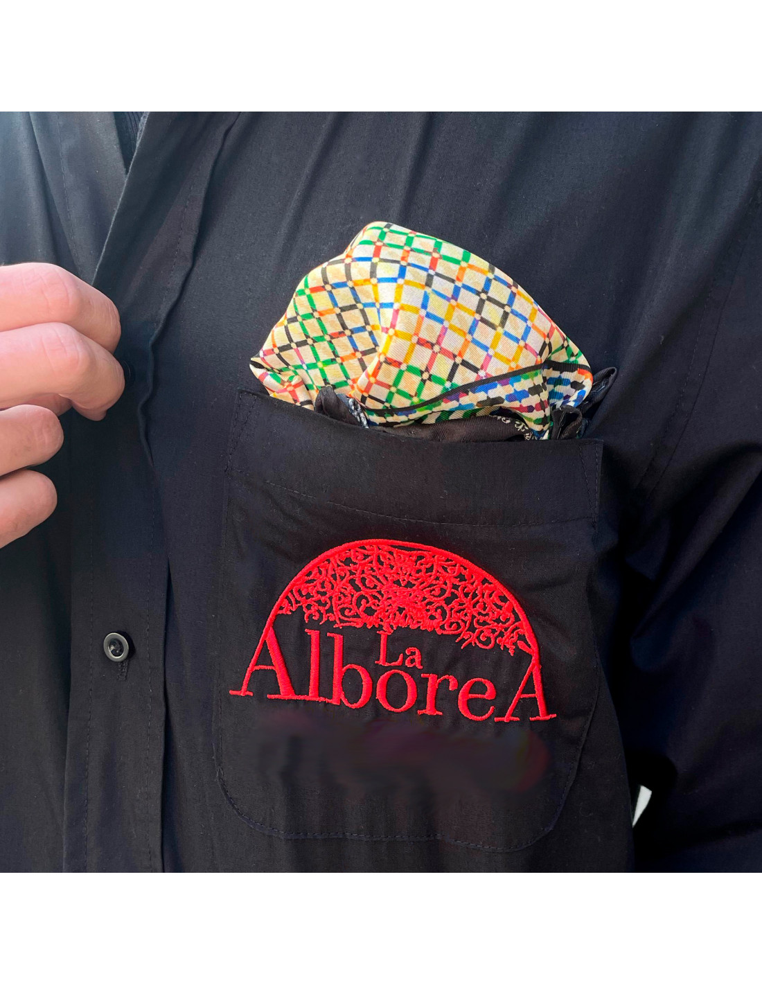 Su tamaño de 33 × 33 cm lo hace perfecto como pañuelo de bolsillo para traje o americana, añadiendo un toque de historia y estilo. Los tonos cálidos combinados con azules y verdes evocan los zócalos de cerámica vidriada de los palacios nazaríes, y su textura suave aporta distinción sin rigidez.