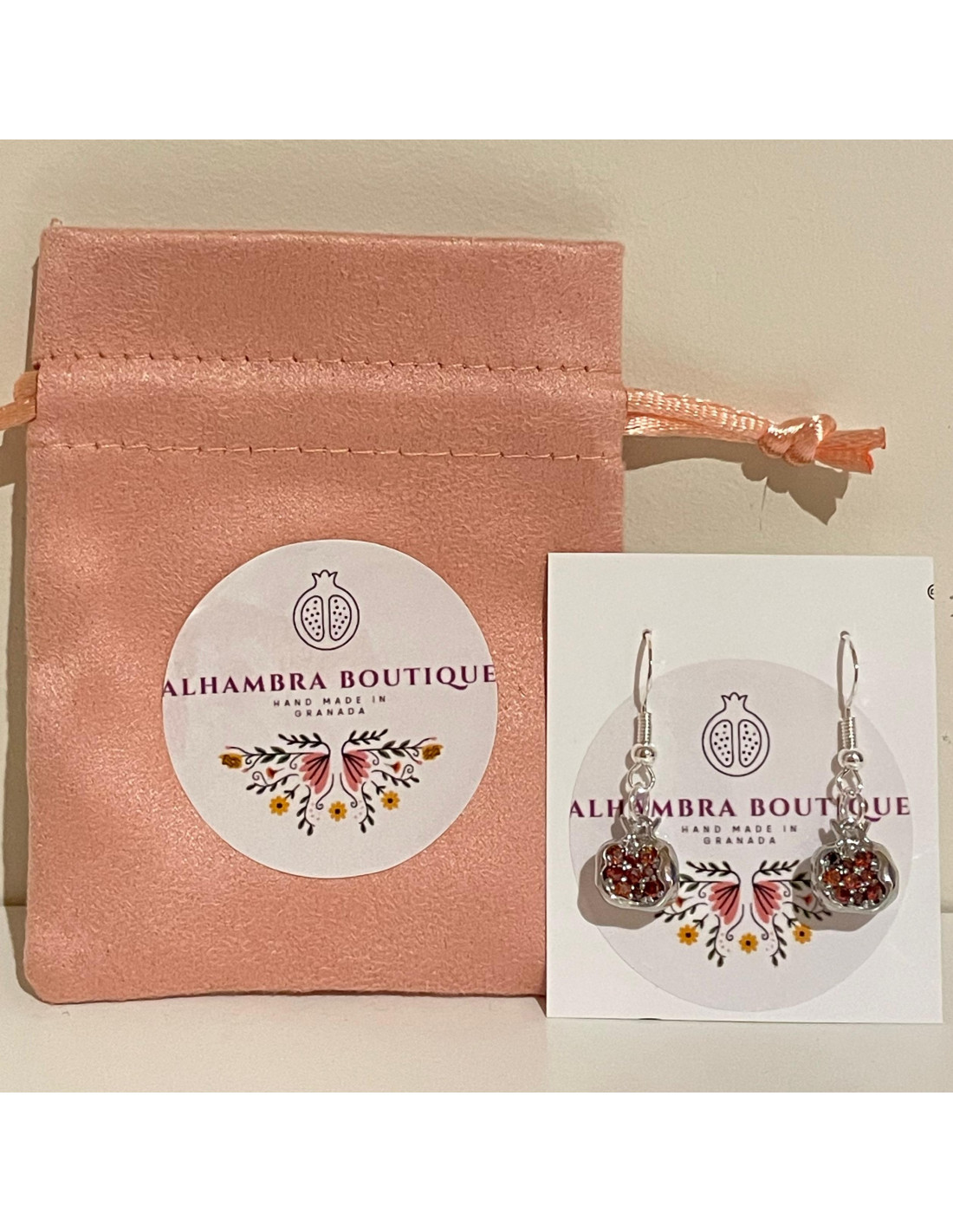 Los pendientes cuentan con un acabado plateado brillante y unas delicadas granadas en su diseño, adornadas con cristales Swarovski que aportan un toque de brillo y lujo. Su estética elegante lo convierte en un accesorio perfecto para cualquier ocasión, realzando tanto looks especiales como diarios. Estos pendientes son un homenaje a la rica herencia cultural de Granada y un complemento ideal para quienes buscan un toque distintivo en su estilo.