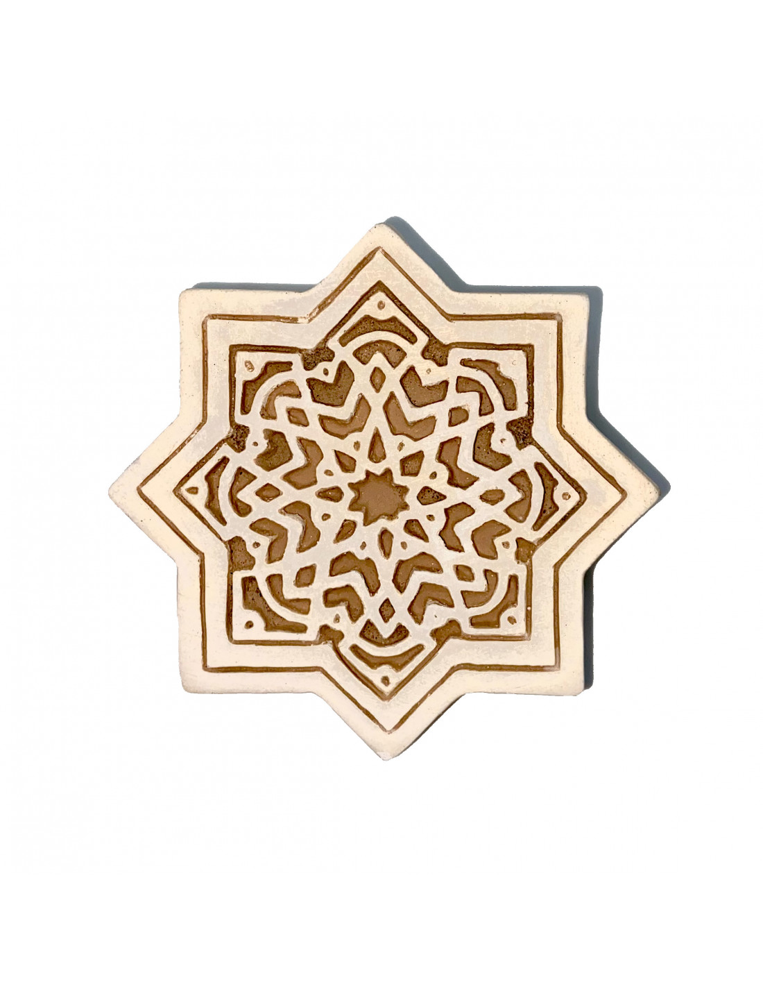 Yesería hecha a mano y decorada con pigmentos minerales y elementos naturales, pátinas terreas de diferentes continentes y con aplicaciones de materiales nobles, lo cual convierte a la pieza en única y diferente al resto