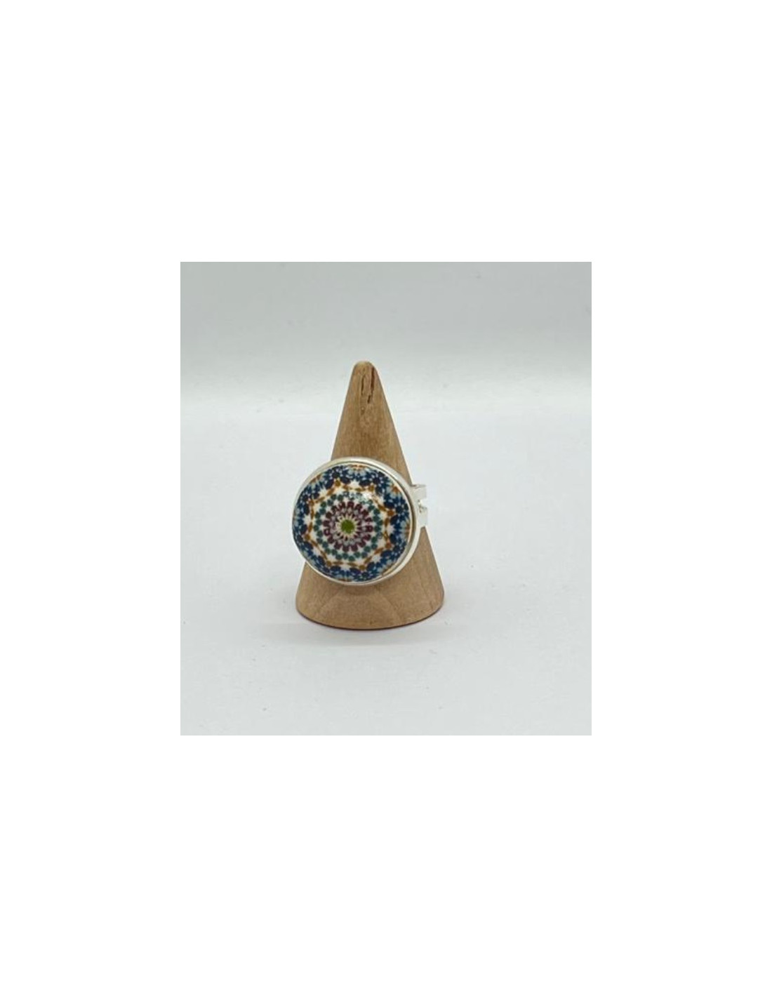 Ring made form high quality brass metal, joined with a ceramic pendant featuring a design inspired by the Mosaics of the Alhambra of Granada. This ring is adjustable and suitable for all ages.