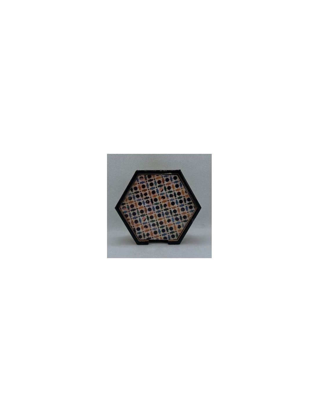 Hexagonal 4 pack of wooden coasters. Designed using the Taracea method and inspired by the Mosaics of the Alhambra of Granada. 13x11cm.