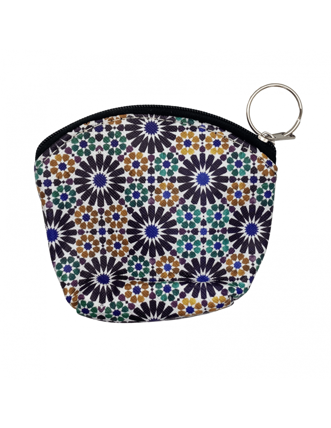 Small Leatherette coin purse with Mosaic design. It has a zipper and a key ring attachment. Mosaic design inspired by the Alhambra.