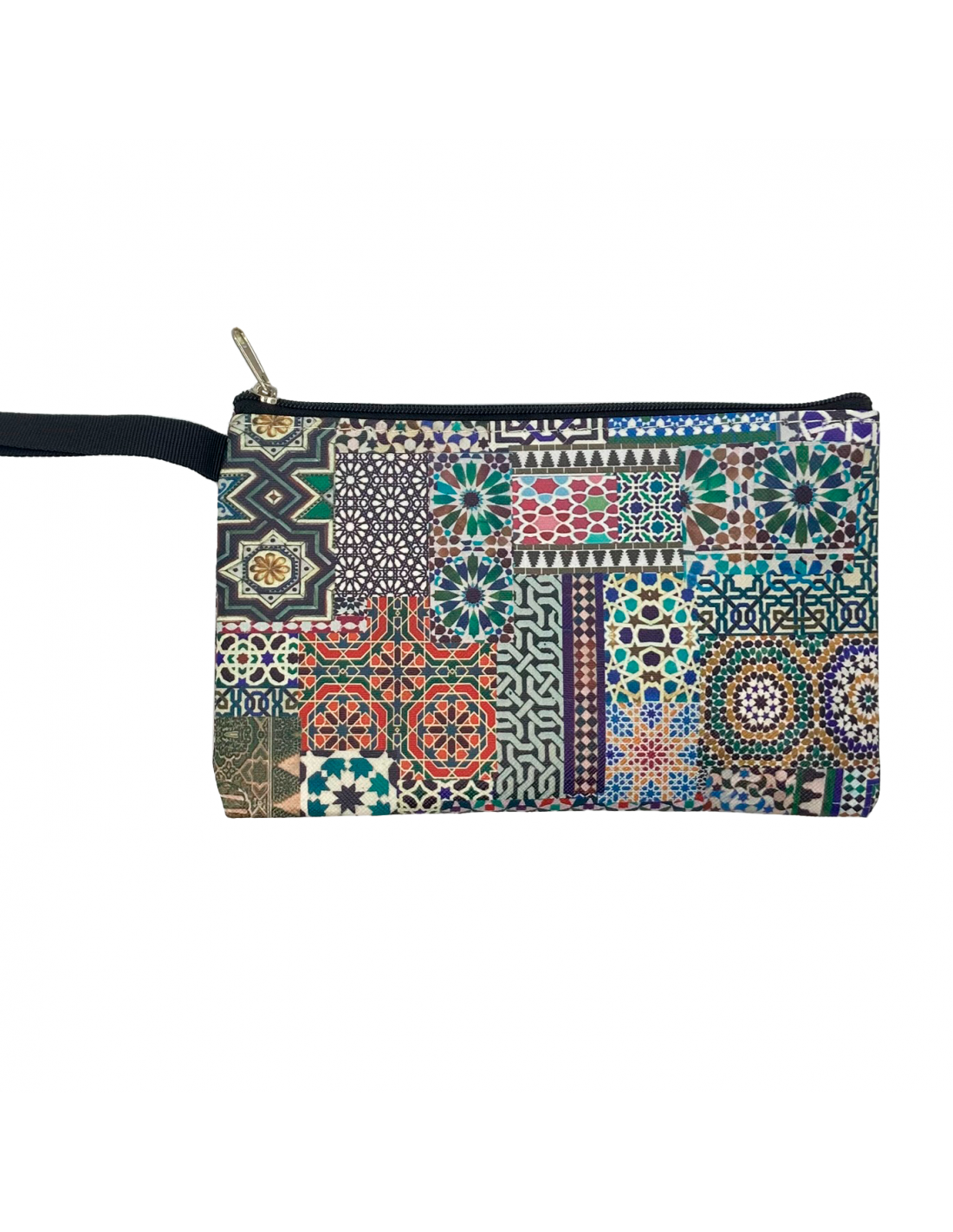 Faux leather rectangular accessory bag with zipper and wristlet attachment. With own illustrations of the mosaics, tiles and plasterwork of the Alhambra in Granada.