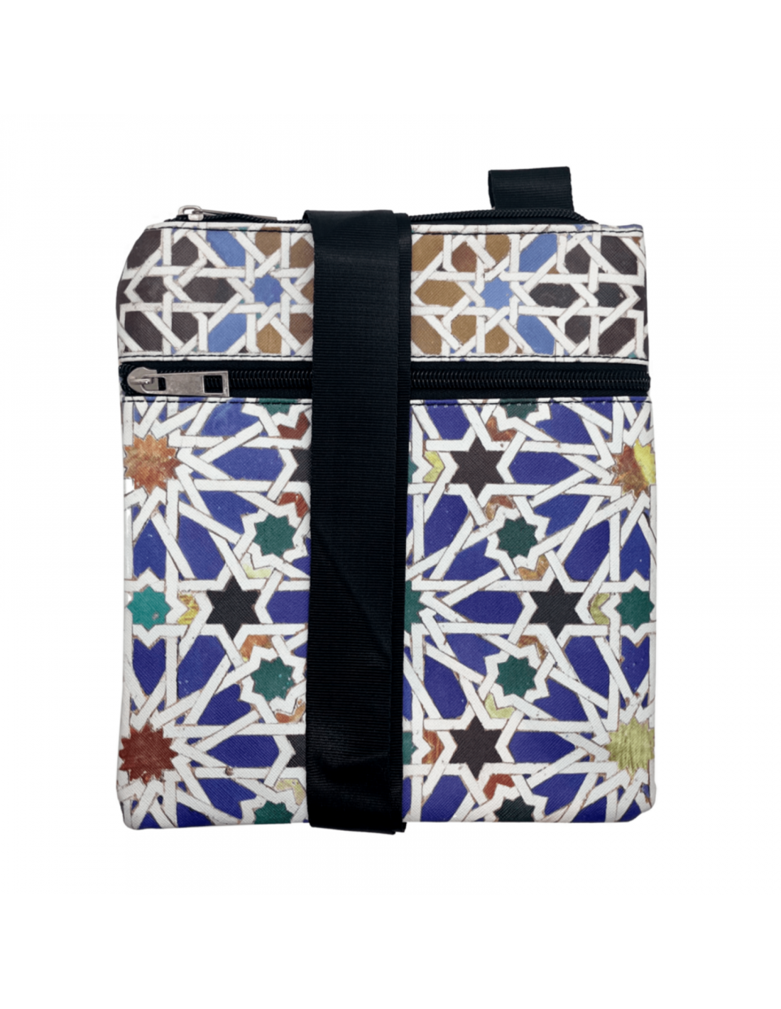 Leatherette shoulder bag with zipper. With it´s own illustrations of the mosaics, tiles and plasterwork of the Alhambra in Granada. Adjustable shoulder strap.