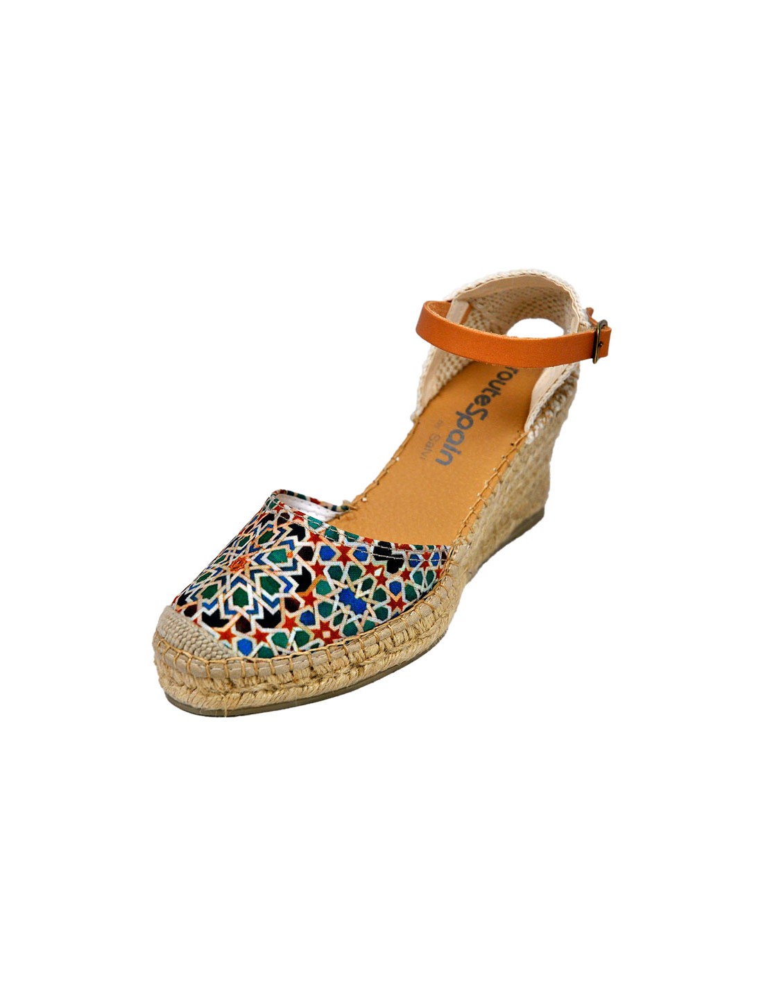 Women's wedge shoes with mosaics inspired by the Alhambra and 100% handmade in Spain. Made in jute platform and leather strap.
