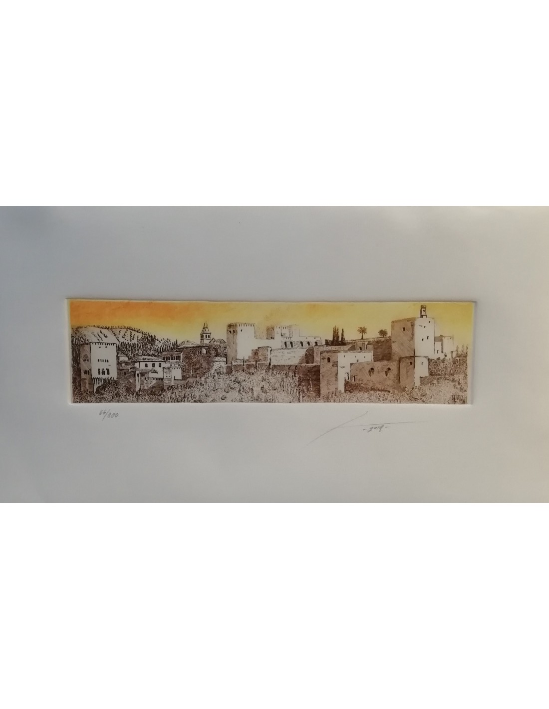 Original etching (66/100) by Guillermo, a local artist from Granada. A panoramic view of the Alhambra in warm tones. Limited edition, hand-signed.