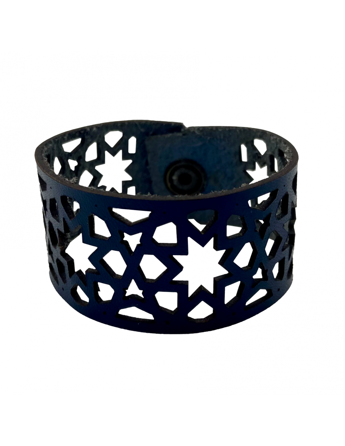 Handmade leather wrist bracelet. Inspired by the lattice window designs of the Alhambra. With a button closure made form stainless steel. One size.