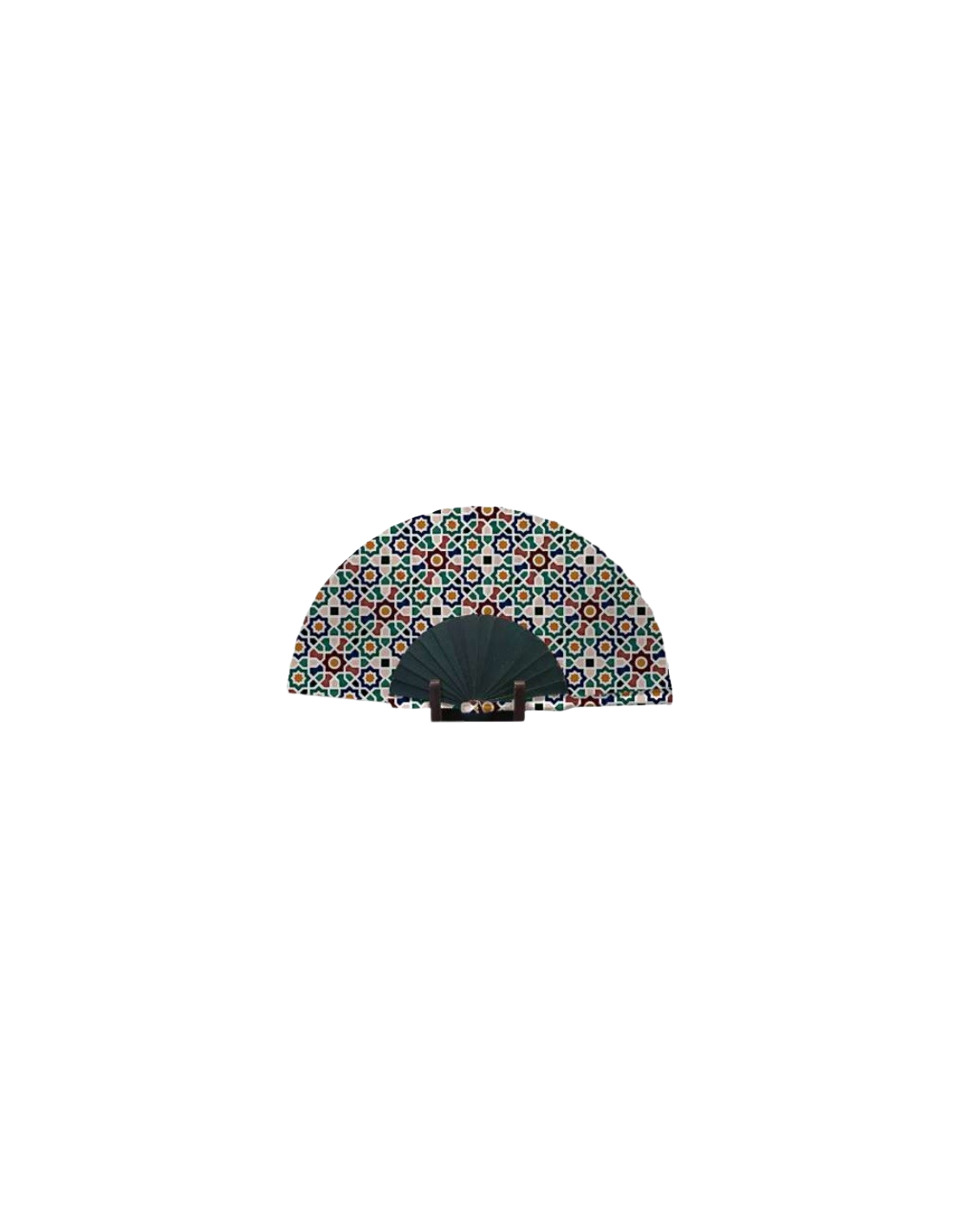 Handheld fan made from natural silk and pear wood rods. Accompanied by a matching cover to keep your fan in pristine condition. Designs inspired by the mosaics, lacework and tiles that can be found within the Alhambra.