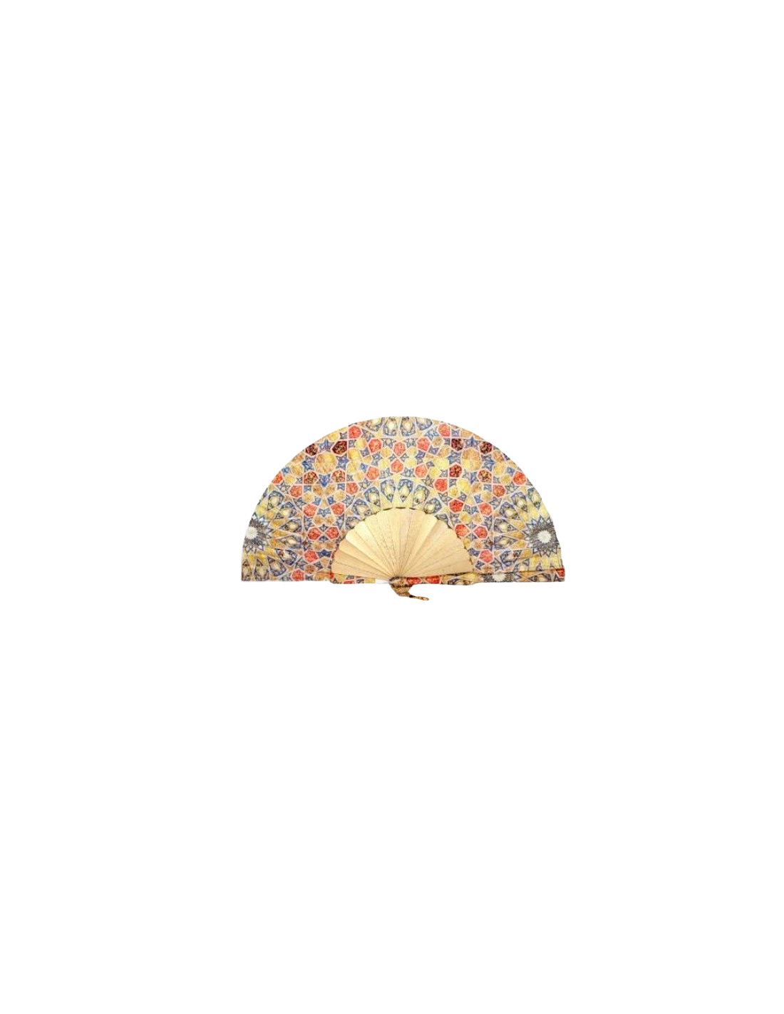 Handheld fan made from natural silk and pear wood rods. Accompanied by a matching cover to keep your fan in pristine condition. Designs inspired by the mosaics, lacework and tiles that can be found within the Alhambra.