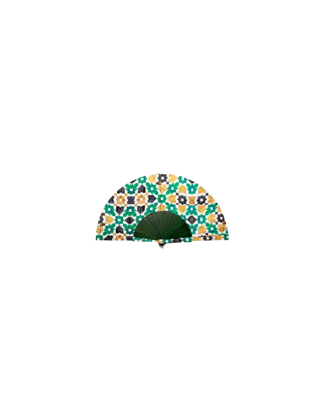 Handheld fan made from natural silk and pear wood rods. Accompanied by a matching cover to keep your fan in pristine condition. Designs inspired by the mosaics, lacework and tiles that can be found within the Alhambra.