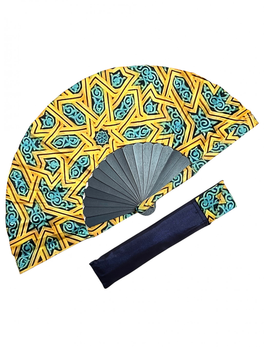Handheld fan made from natural silk and pear wood rods. Accompanied by a matching cover to keep your fan in pristine condition. Designs inspired by the mosaics, lacework and tiles that can be found within the Alhambra.