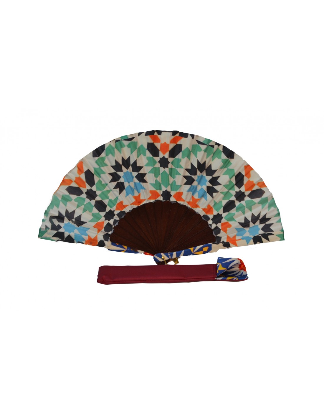 Handheld fan made from natural silk and pear wood rods. Accompanied by a matching cover to keep your fan in pristine condition. Designs inspired by the mosaics, lacework and tiles that can be found within the Alhambra.