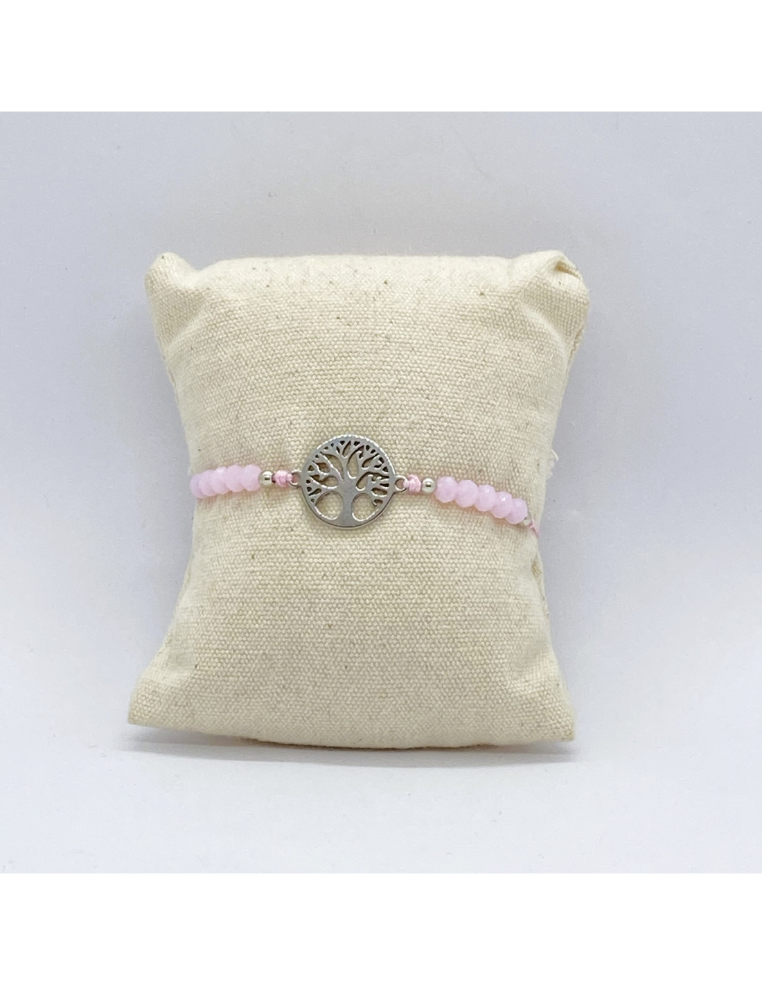 This bracelet features a silver Tree of Life pendant paired with light pink crystal beads.