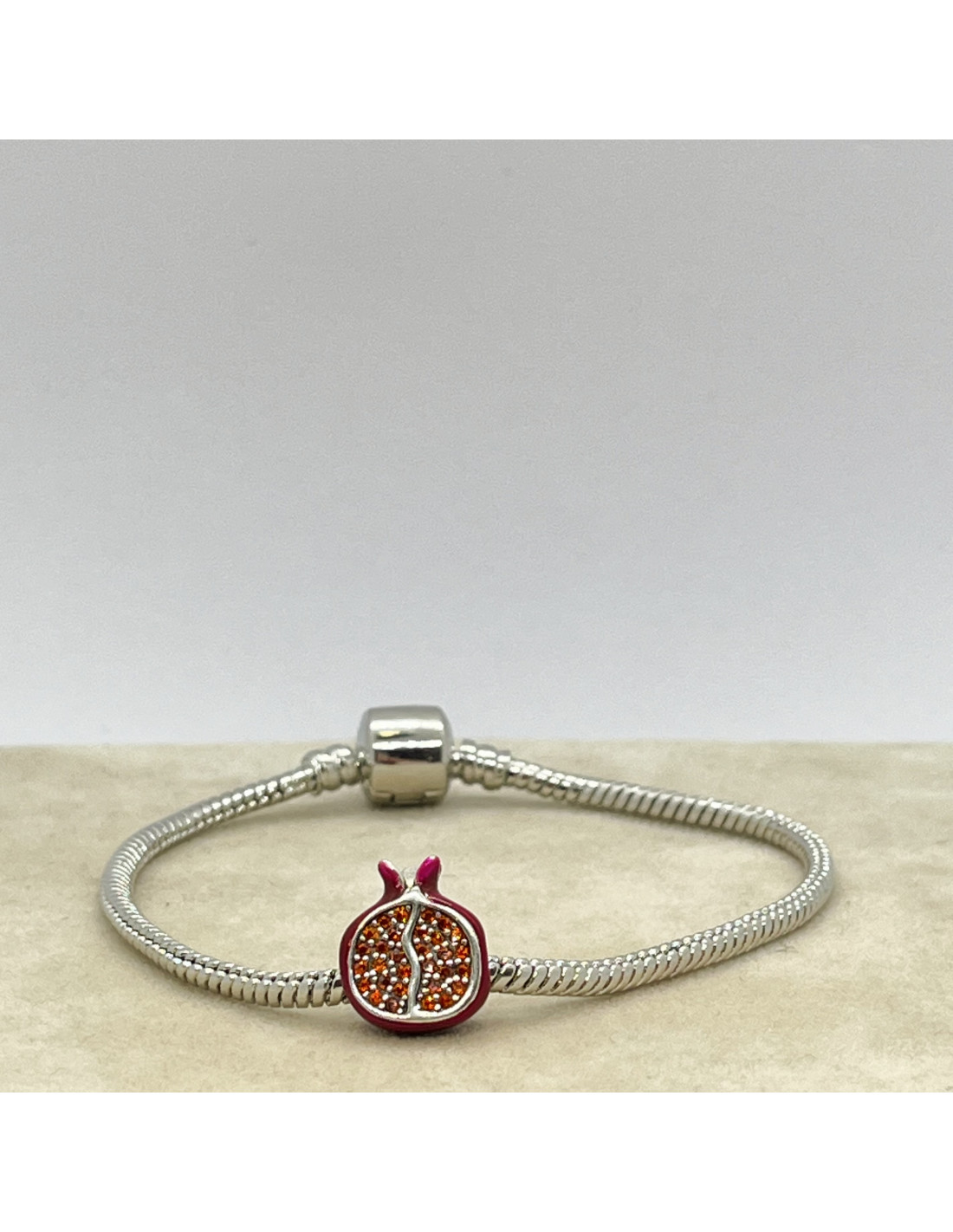 Silver and zirconium charm, with stainless Steel bracelet. Fits Pandora bracelets. Orange, red and silver stones in the centre with a red shell.