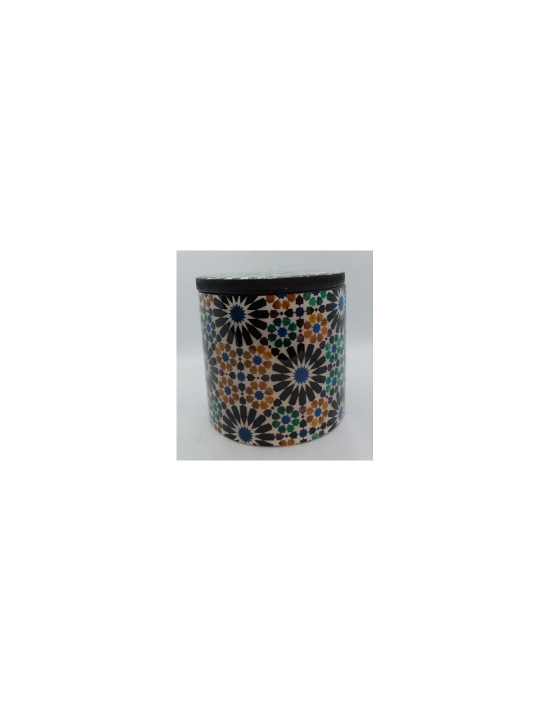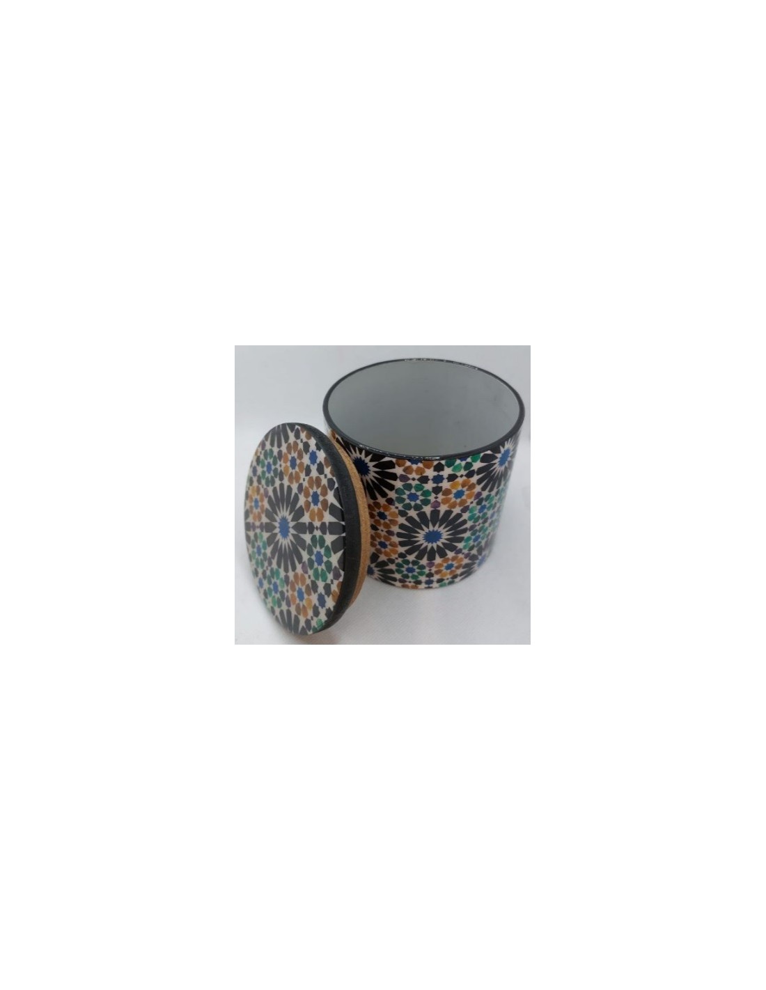 Large cylindrical wooden jar with lid. Designed using the Taracea method and inspired by the Mosaics of the Alhambra of Granada. 11x11cm.