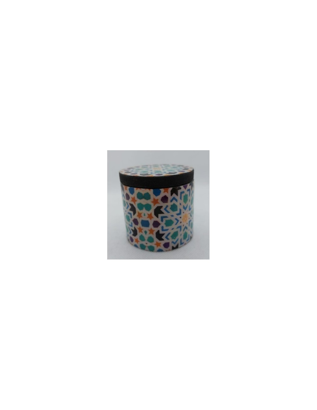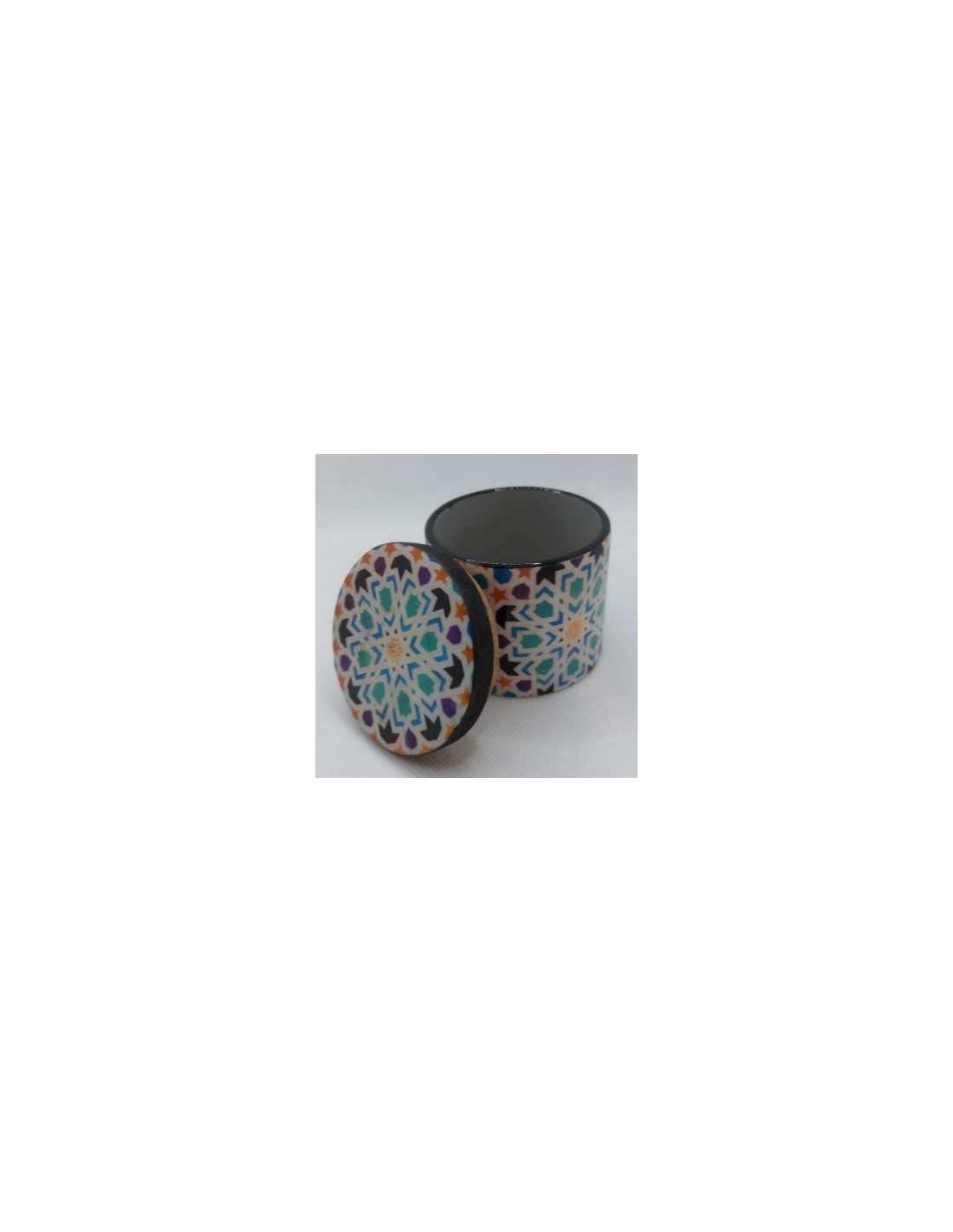 Small cylindrical wooden jar with lid. Designed using the Taracea method and inspired by the Mosaics of the Alhambra of Granada. 8.5x9cm.