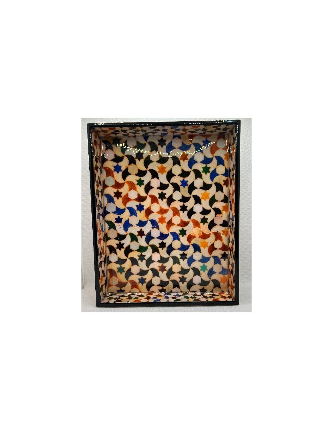 Rectangular wooden tray. Designed using the Taracea method and inspired by the Mosaics of the Alhambra of Granada. 20x20.5cm.