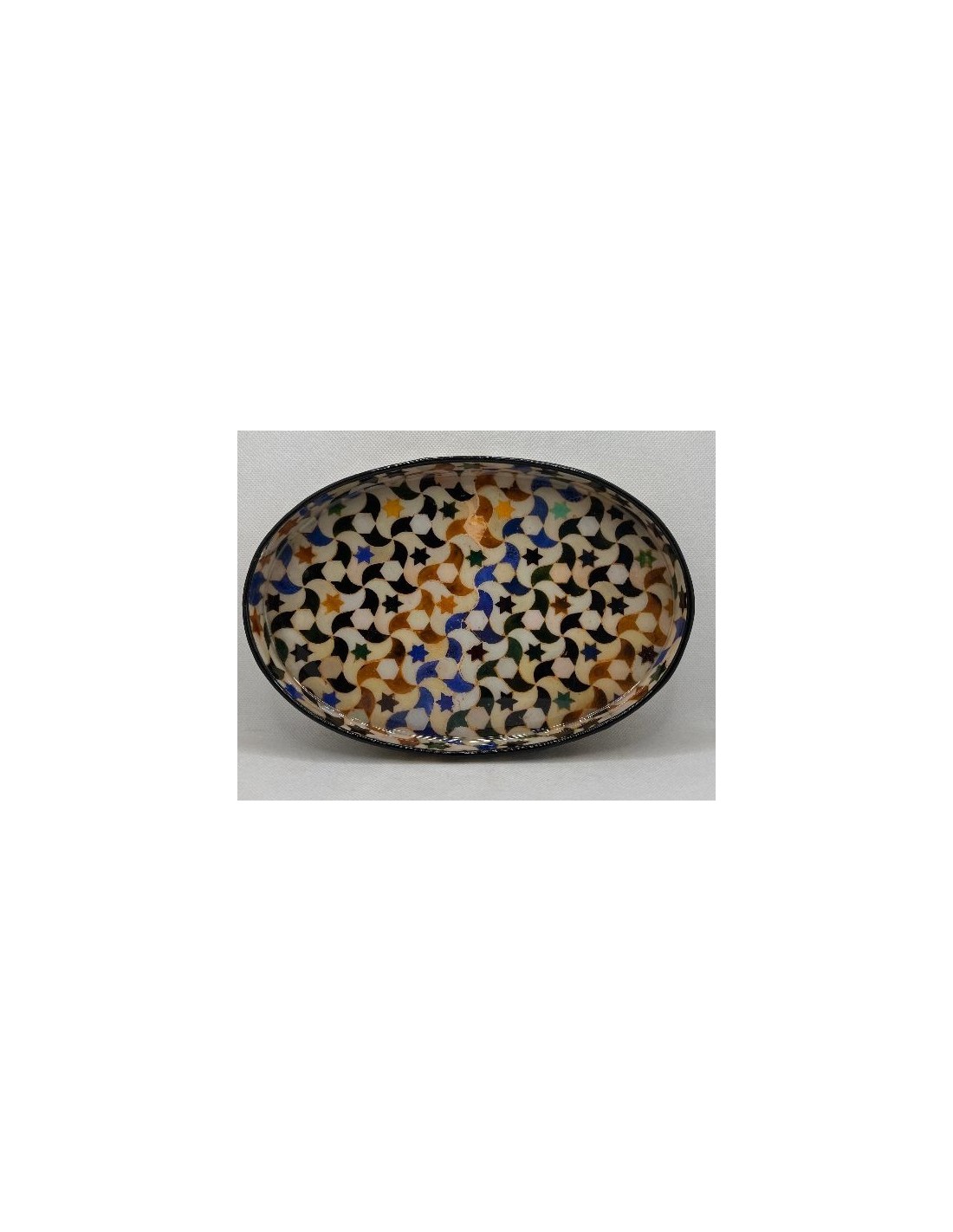 Oval wooden tray. Designed using the Taracea method and inspired by the Mosaics of the Alhambra of Granada. 15.5x23cm.