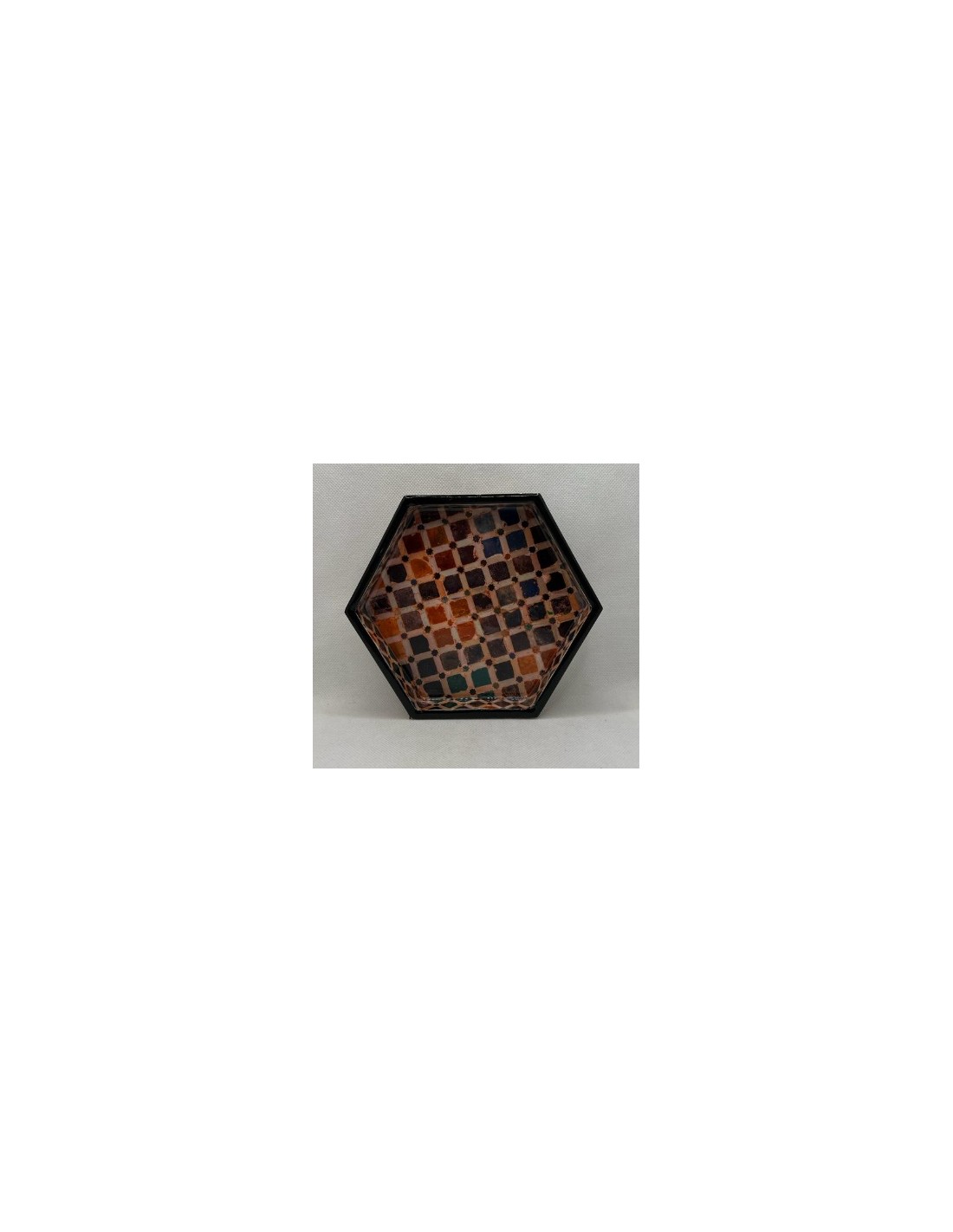 Hexagonal wooden tray. Designed using the Taracea method and inspired by the Mosaics of the Alhambra of Granada. 17x15cm.