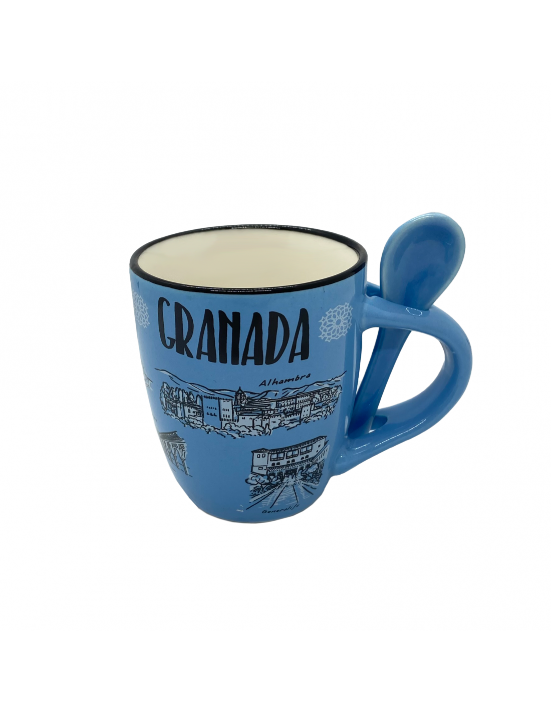 Discover the charm of Granada with this beautiful ceramic mug with integrated spoon, a perfect souvenir to remember the magic of the city. Its detailed design includes illustrations of the Alhambra, the Generalife and other emblematic corners, evoking the essence of its rich history and unparalleled beauty.