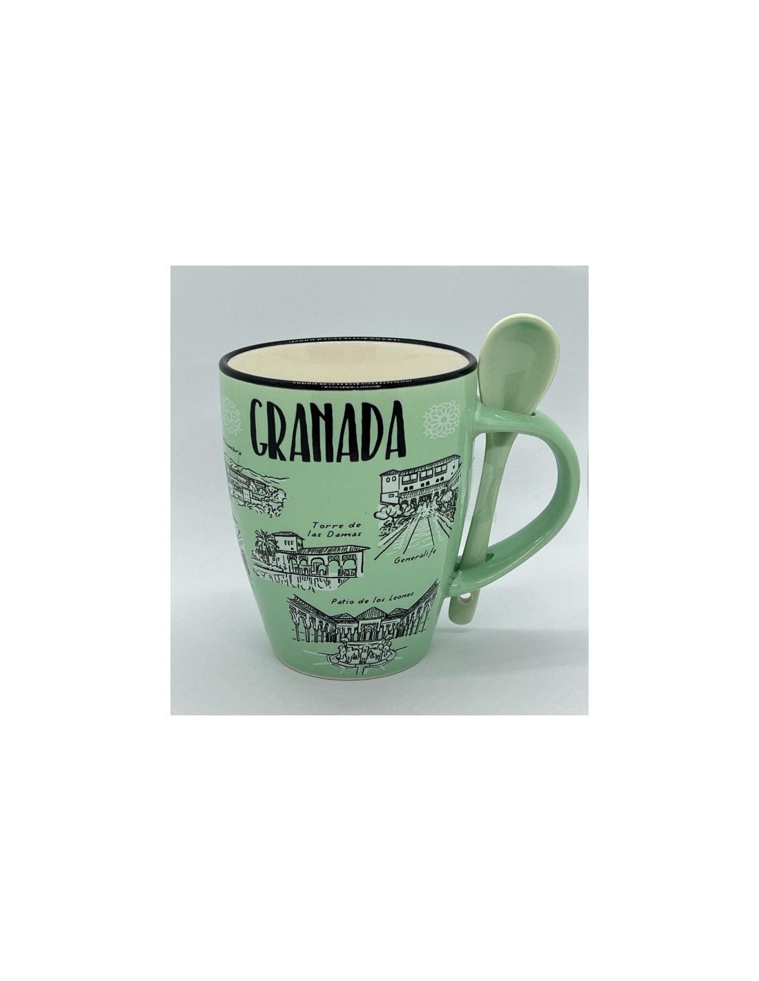 Ceramic cup with spoon holder handle and small matching coloured spoon. Green design. 250ml