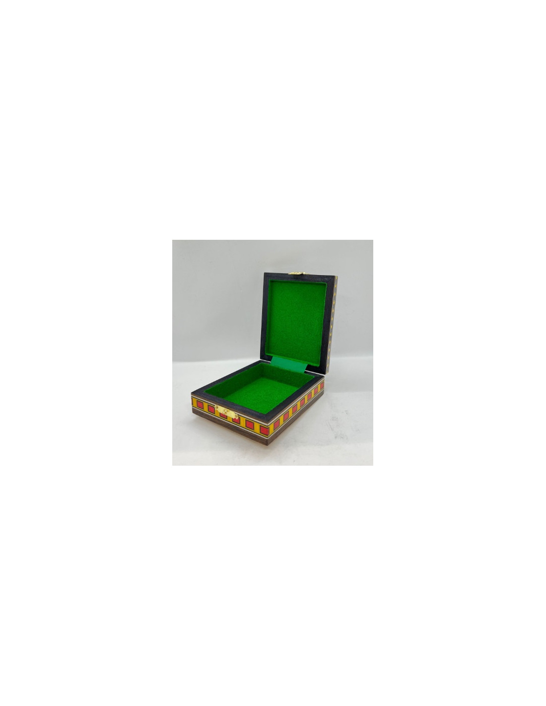 Fabric lined wooden box with metal hardware and Traditional Taracea pattern. Designs inspired by the Mosaics of the Alhambra, Granada. Finished with a lacquer applied by hand by experts in Granada to ensure that the design and quality stays in perfect condition and lasts a long time.