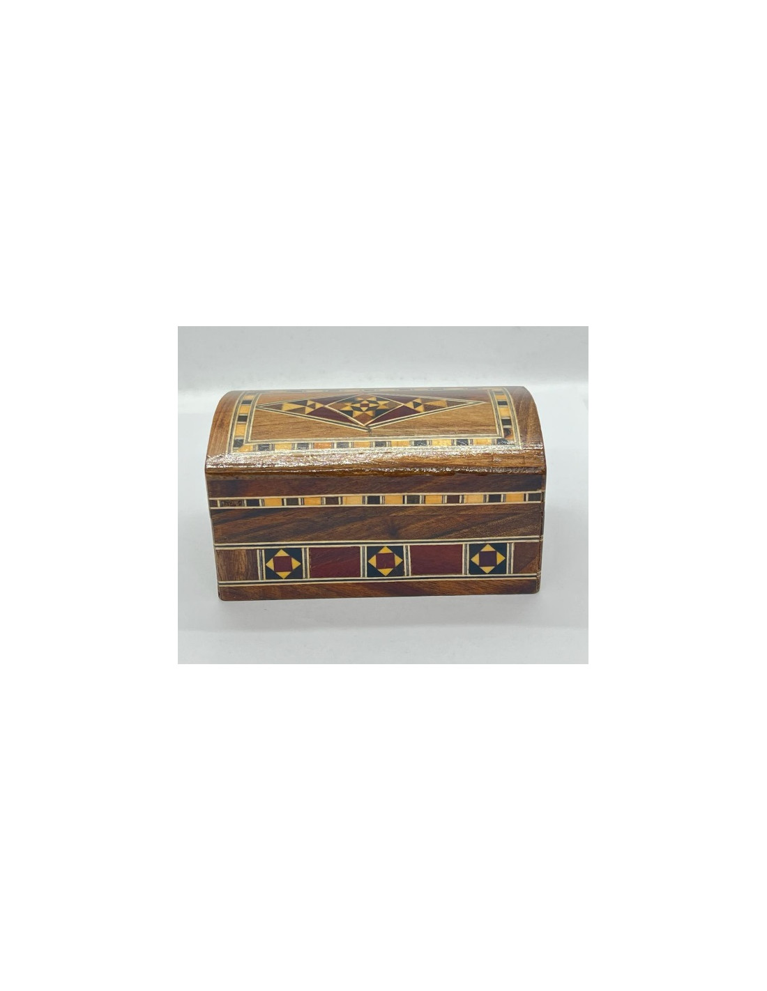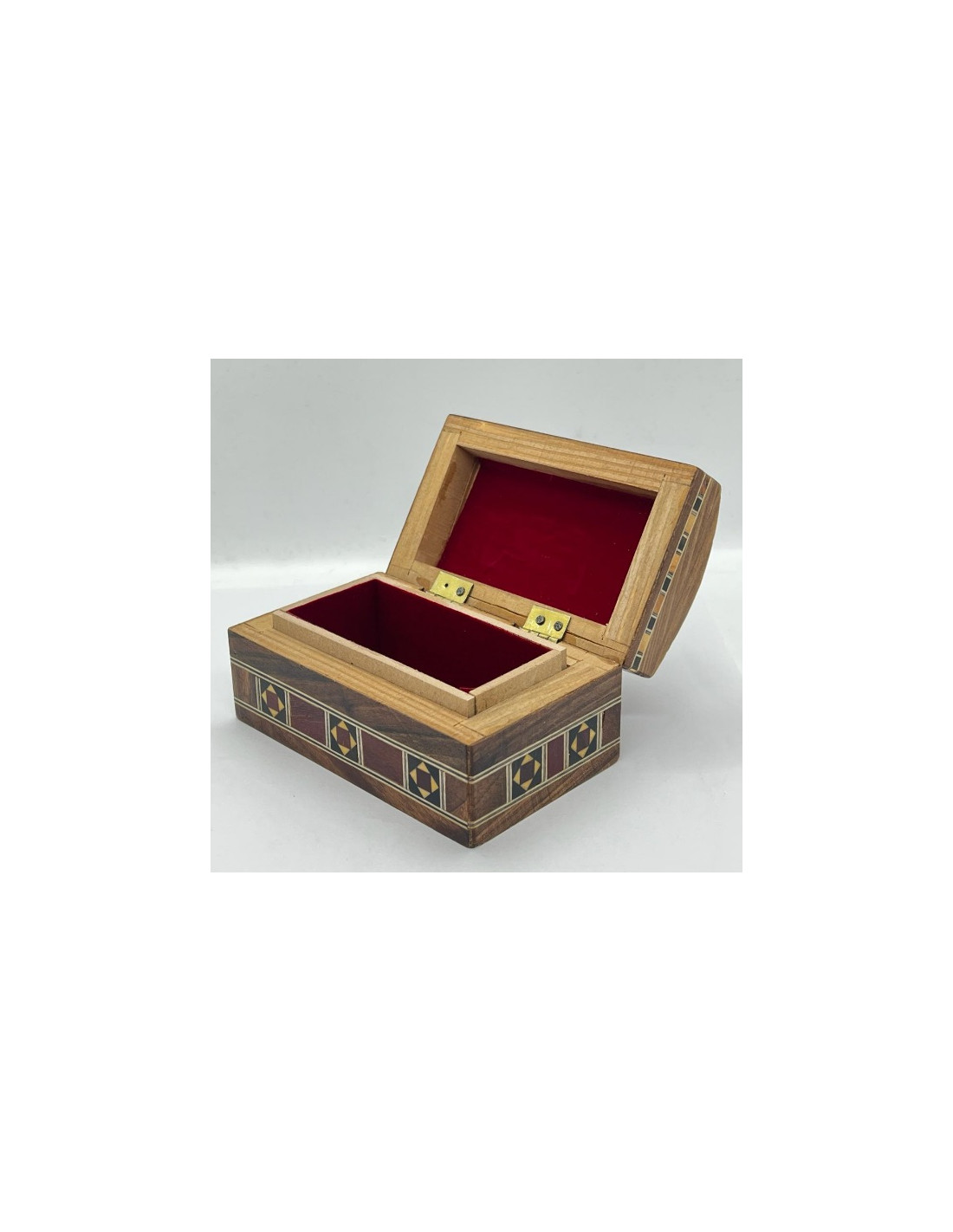 Fabric lined wooden box with metal hardware and Traditional Taracea pattern. Designs inspired by the Mosaics of the Alhambra, Granada. Finished with a lacquer applied by hand by experts in Granada to ensure that the design and quality stays in perfect condition and lasts a long time.
